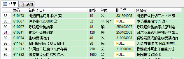 我们看到,原Excel文件工作表第90行(SQL是第89行,因为Excel中第一行在SQL中成了列名)、编码 = '610507'的数据的物价码成了NULL。