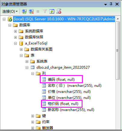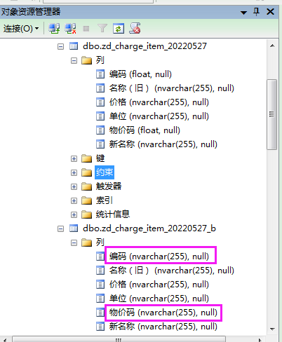 查看SQL中zd_charge_item_20220527的列属性,发现【编码】和【物价码】这两列是数据类型是float(如下图所示),其它4列是NVARCHAR类型。