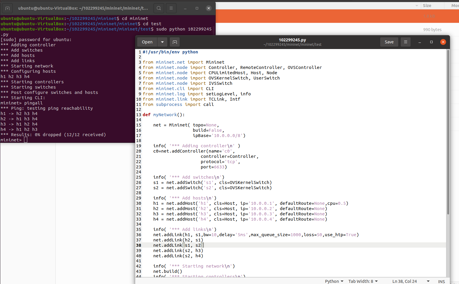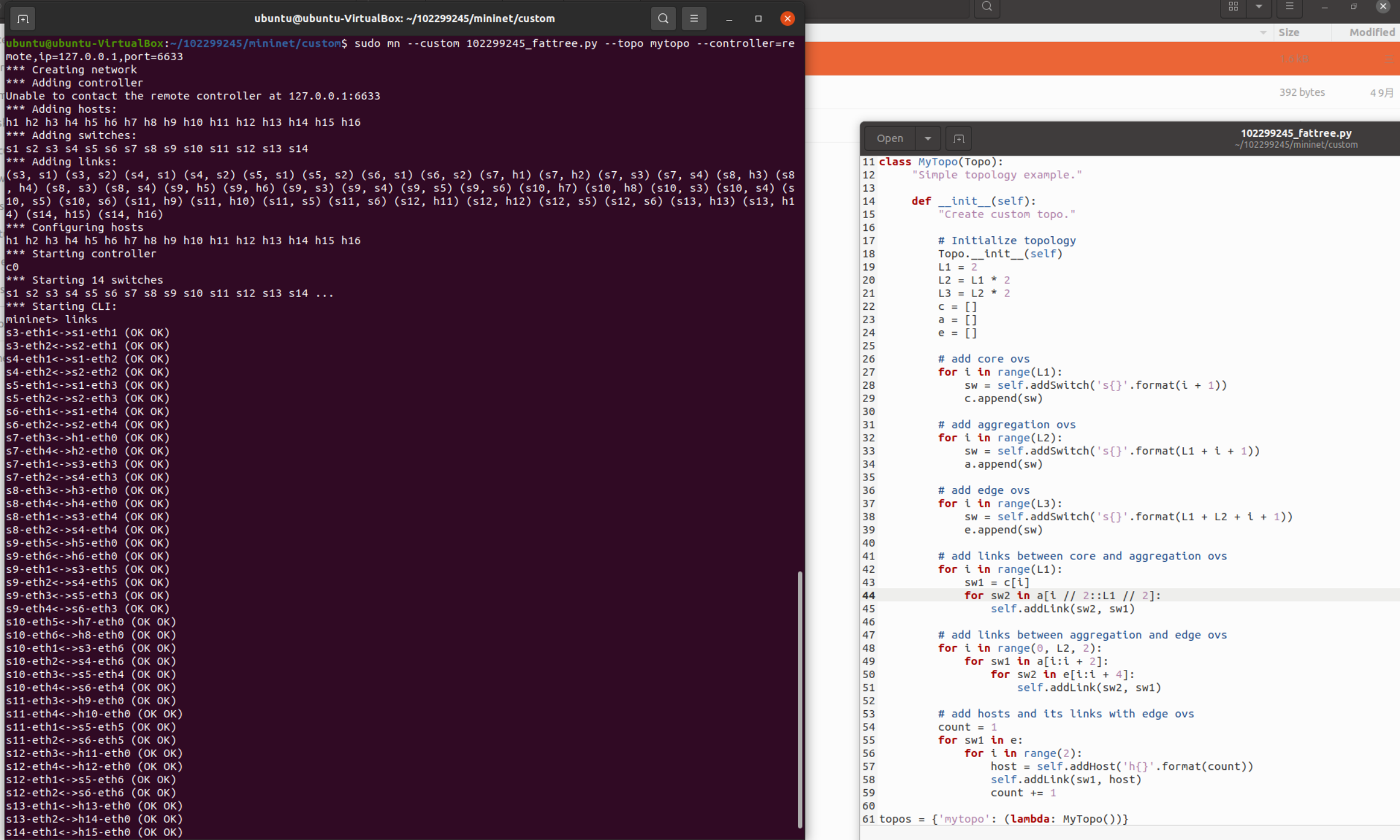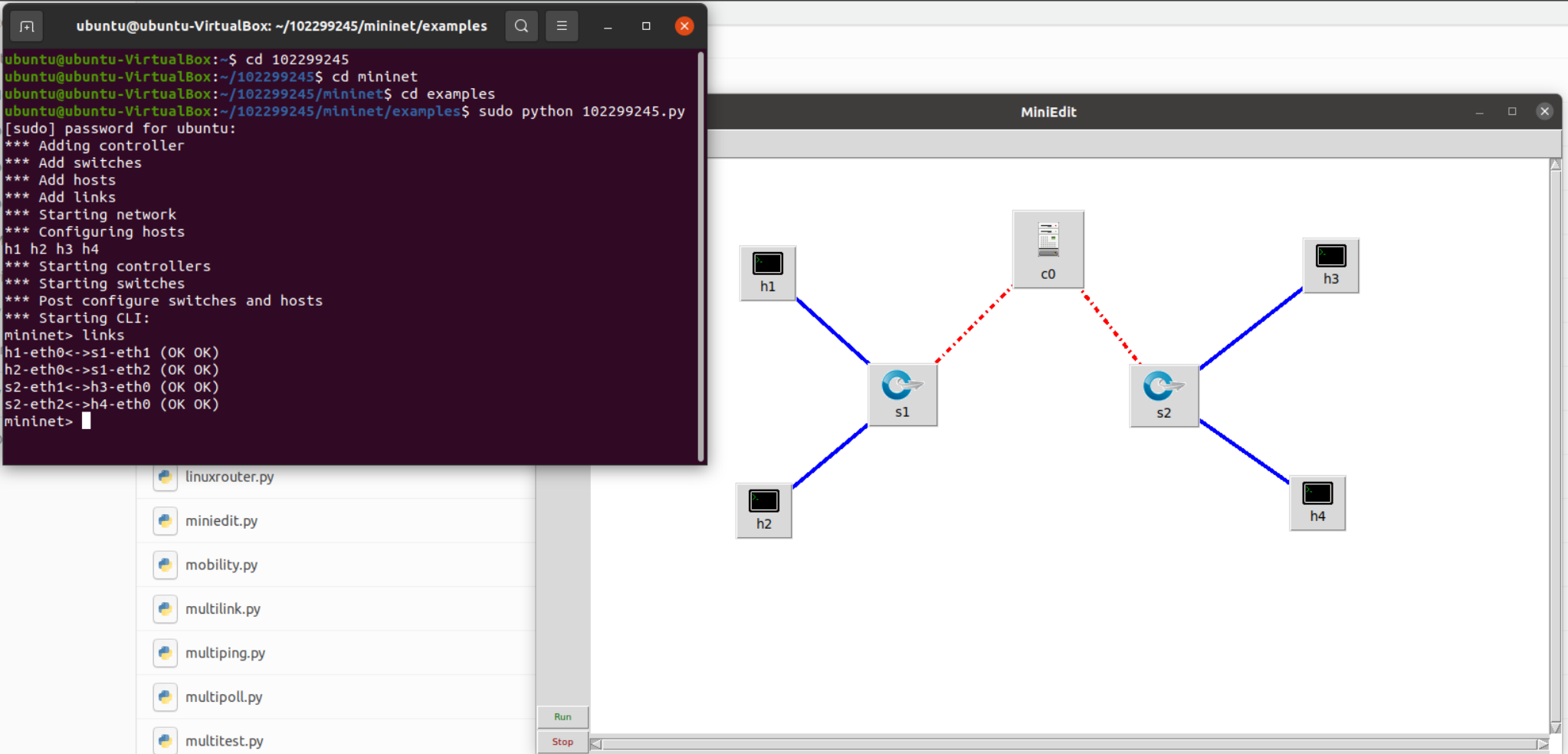 - 一开始运行miniedit.py出现报错“Error:No module named mininet.log”,查看课件内的pdf得知是软链接的问题,问题通过以下代码解决: