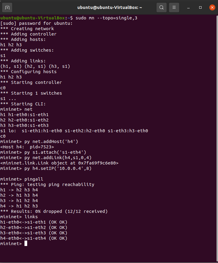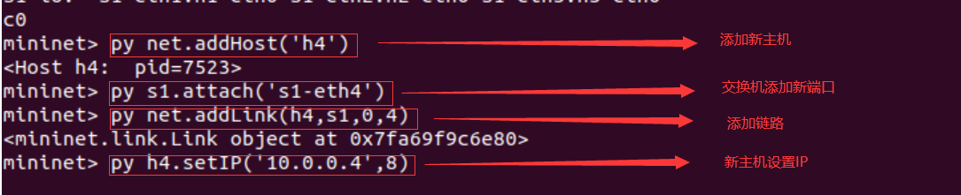- 在2 b)的基础上,在Mininet交互界面上新增1台主机并且连接到交换机上,再测试新拓扑的连通性。