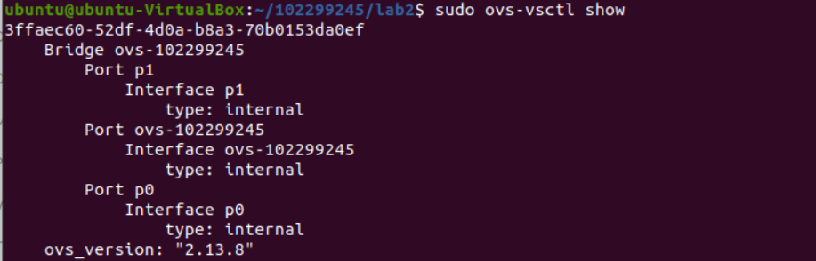 a) /home/用户名/学号/lab2/目录下执行ovs-vsctl show命令、以及p0和p1连通性测试的执行结果截图;