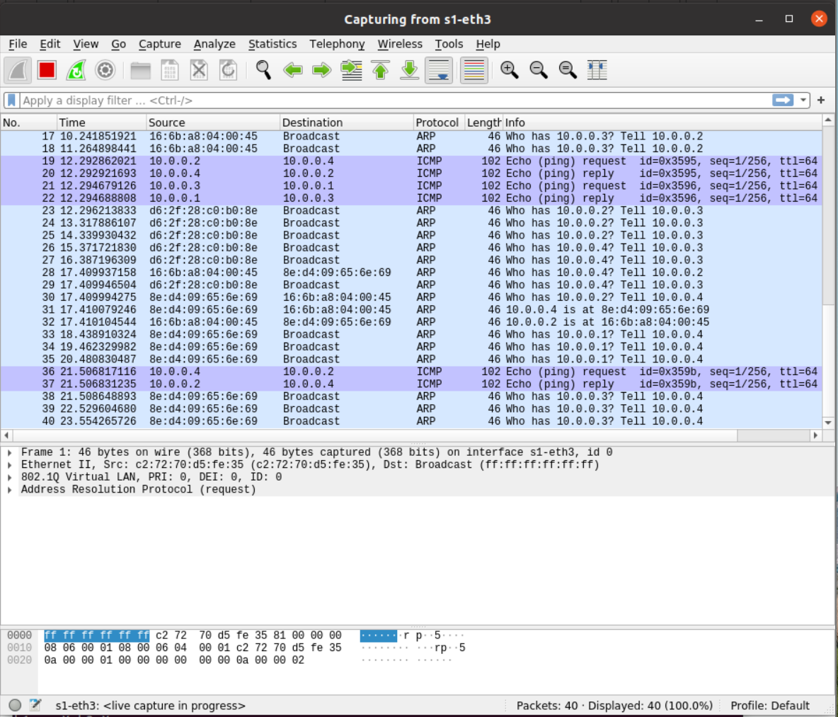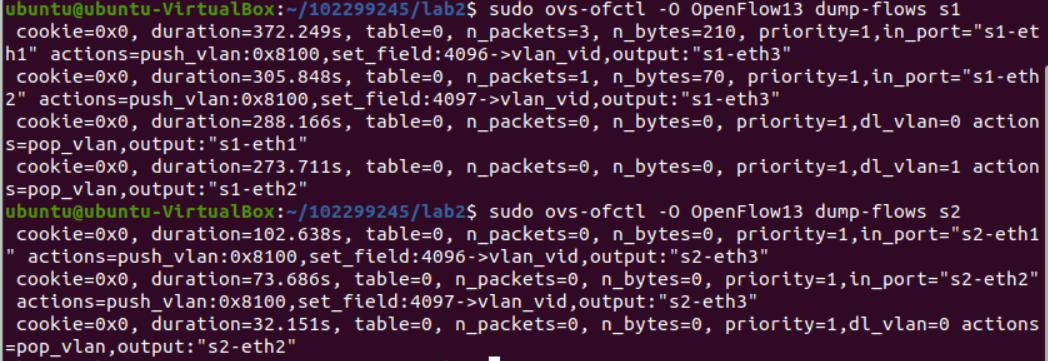 s2.cmd('sudo ovs-ofctl -O OpenFlow13 add-flow s2 priority=1,in_port=2,actions=push_vlan:0x8100,set_field:4097-\>vlan_vid,output:3')