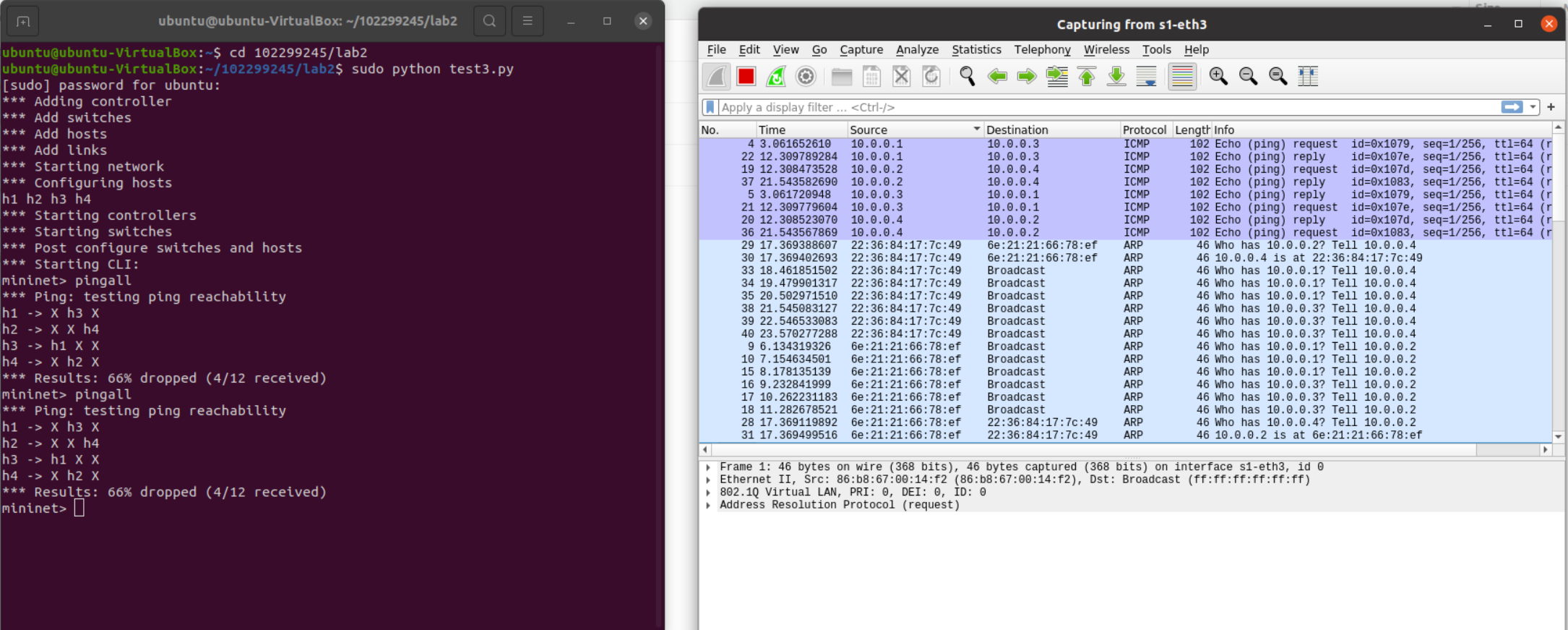 b) /home/用户名/学号/lab2/目录下开启Mininet CLI并执行pingall命令的截图、上述目录下查看OVS流表的命令结果截图,wireshark抓包截图,其余文字请勿赘述,否则扣分;