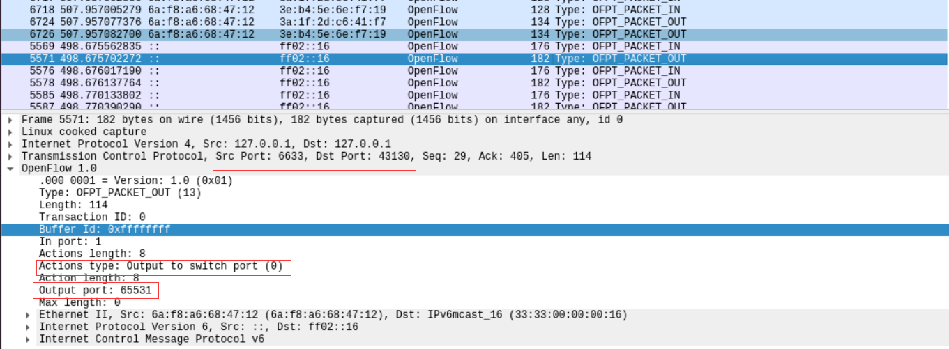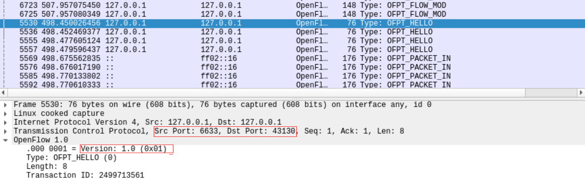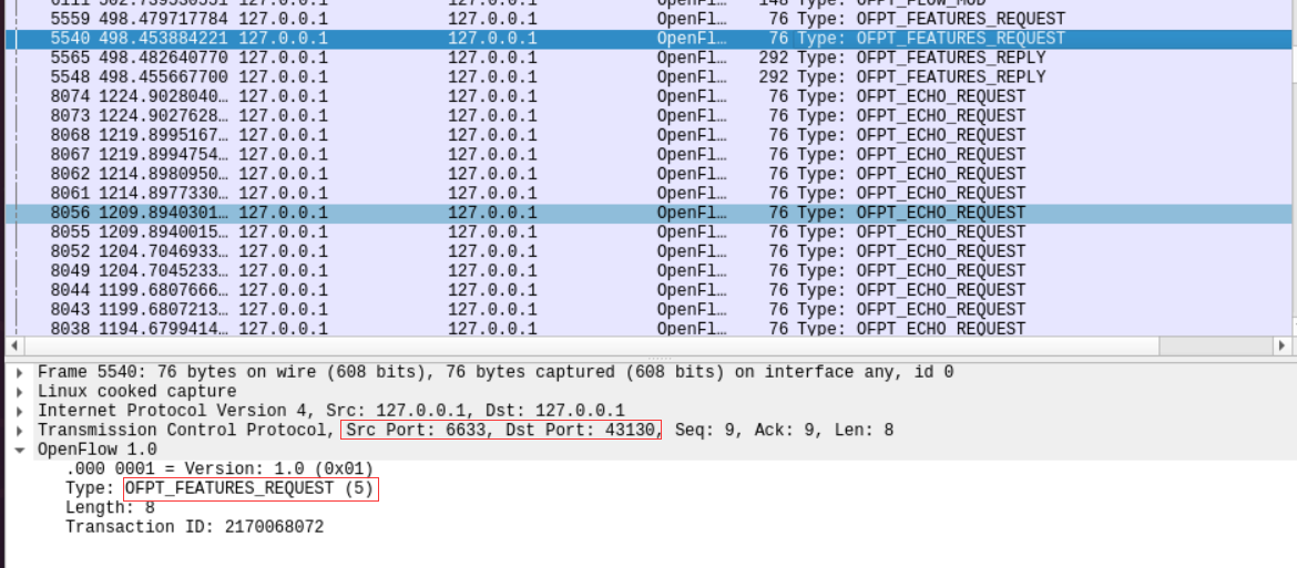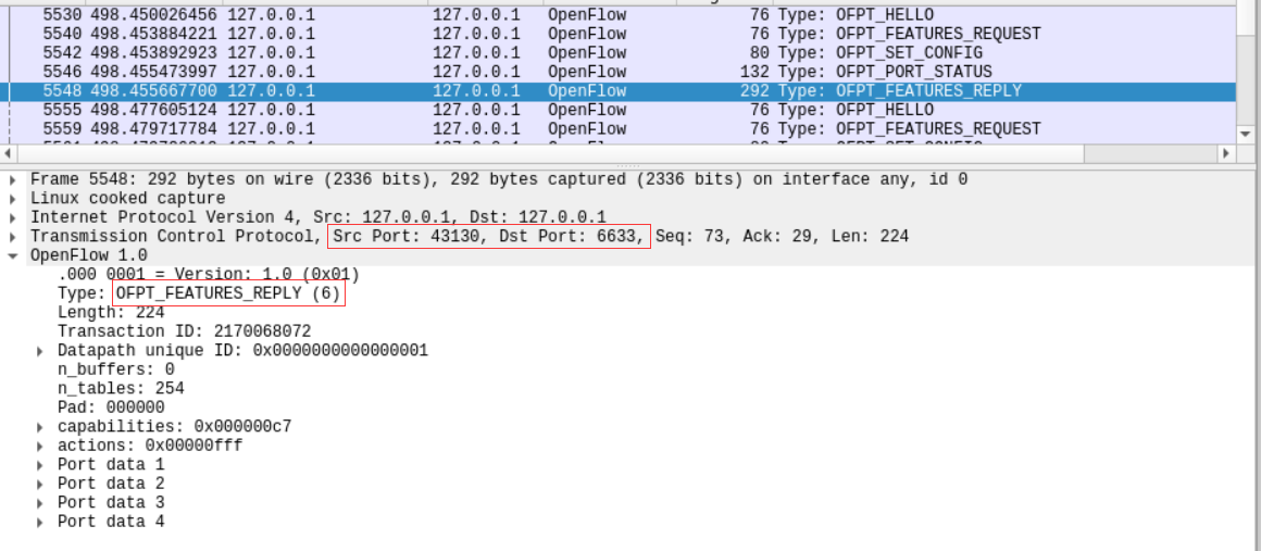 - 控制器6633端口(我最高能支持OpenFlow 1.0) ---> 交换机43130端口