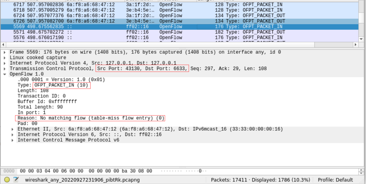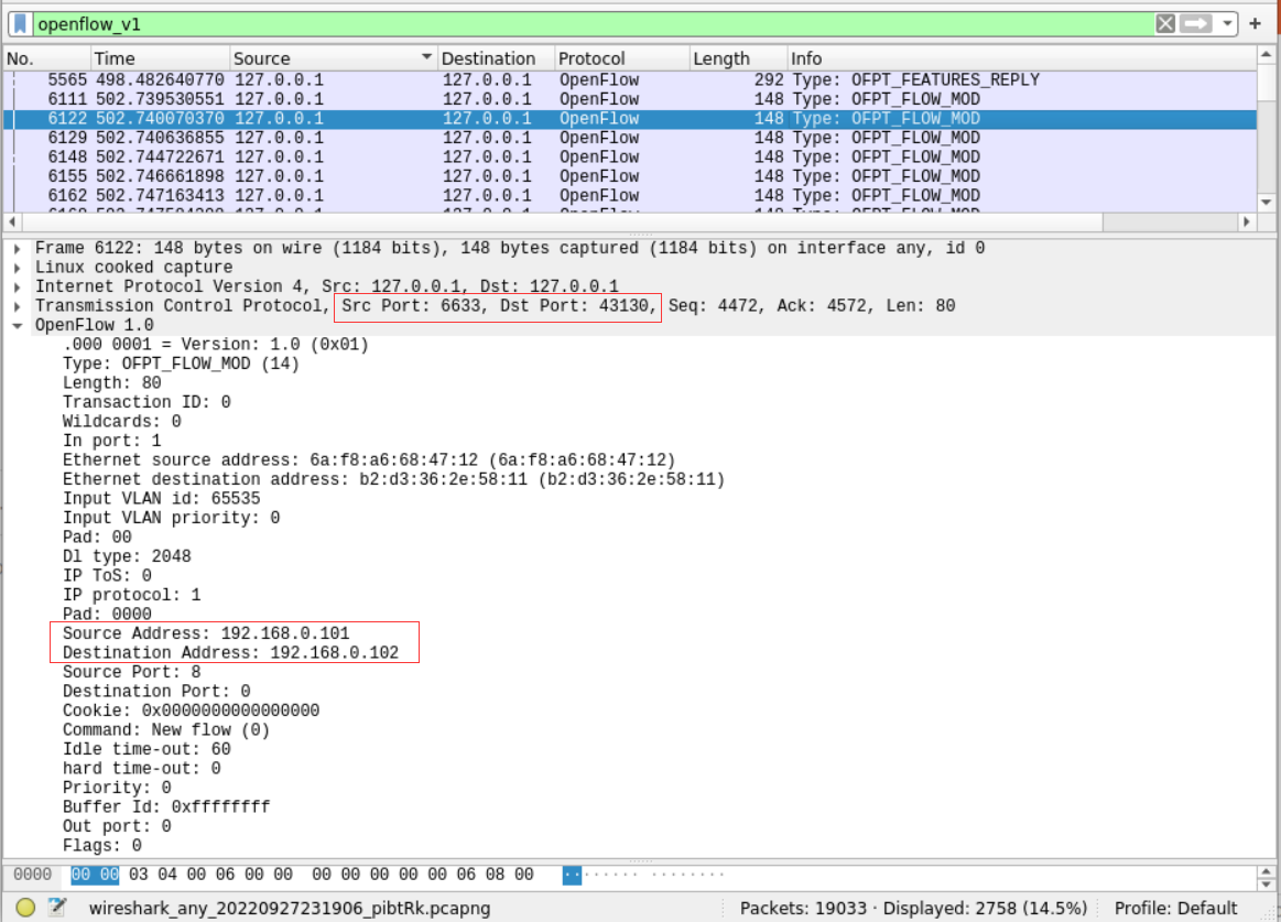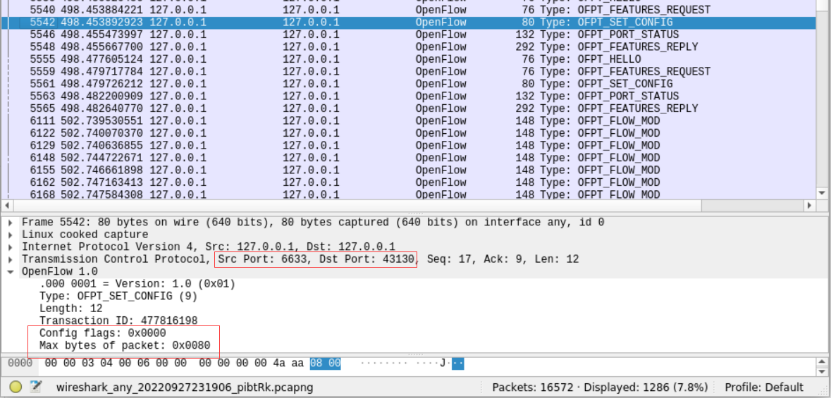 - 控制器6633端口(请按照我给你的flag和max bytes of packet进行配置) ---> 交换机43130端口
