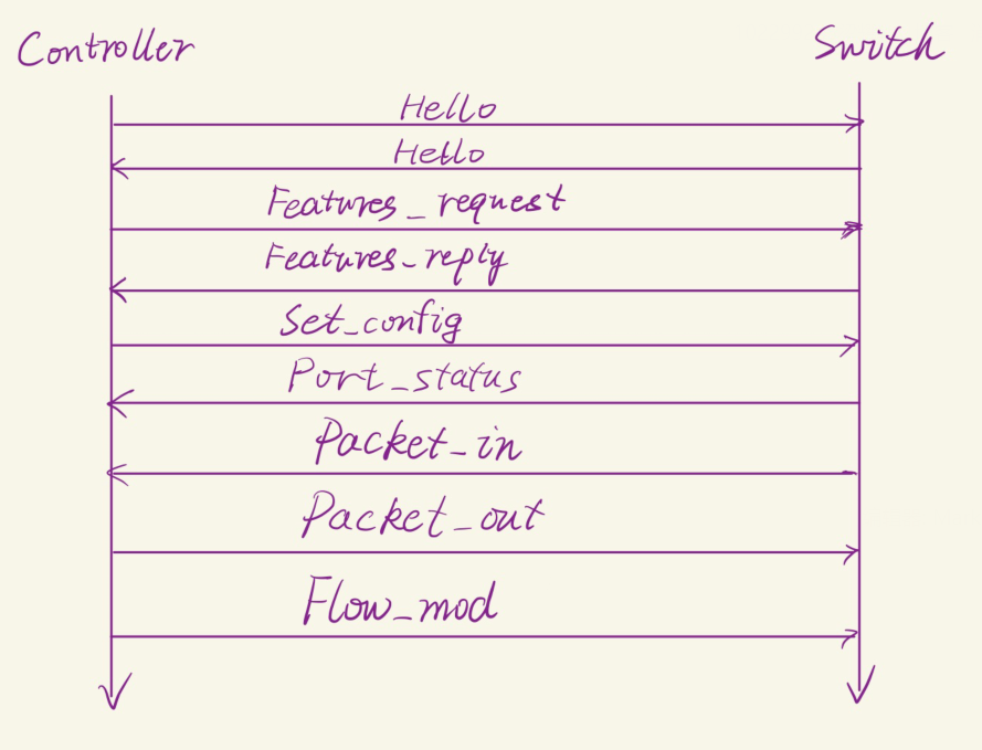 控制器与交互及互相发送 Hello 消息。Hello消息中只包含有ofp_header,包括:version,type,length,transaction ID,其中的version 字段为发送方所支持的最高版本 OpenFlow,type字段为OFPT_HELLO。