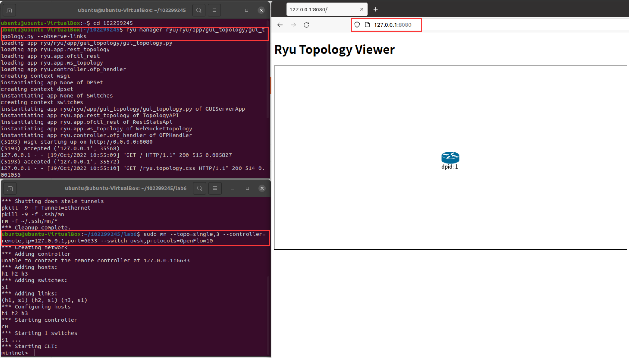 1.搭建下图所示SDN拓扑,协议使用Open Flow 1.0,并连接Ryu控制器,通过Ryu的图形界面查看网络拓扑。