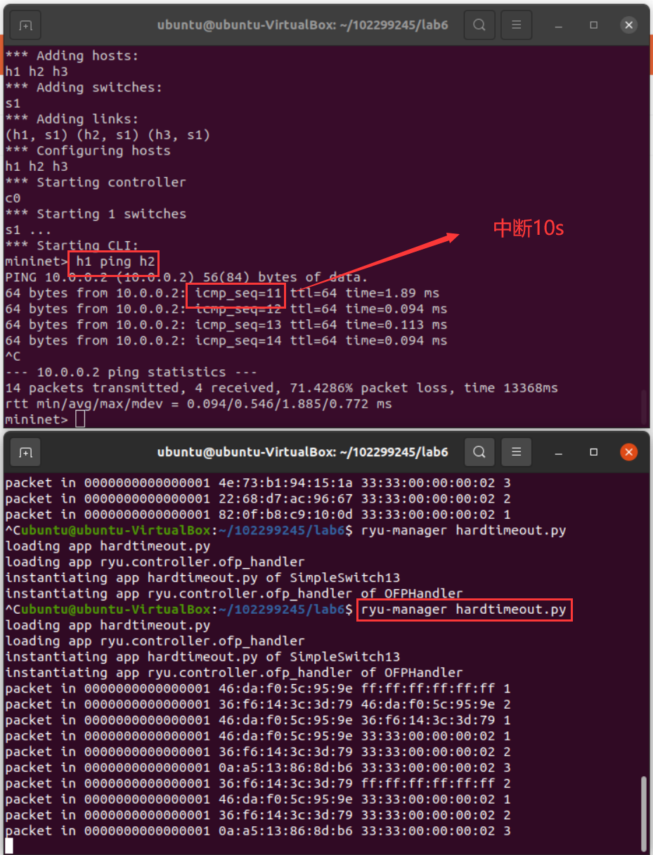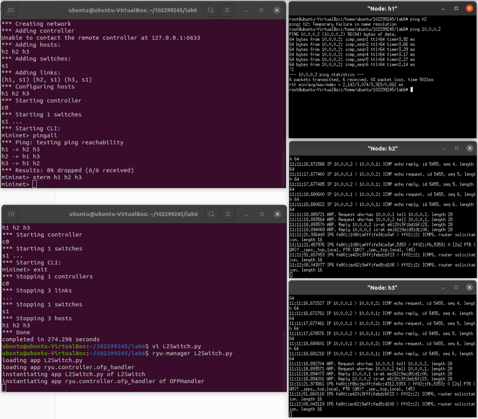 2.阅读Ryu文档的The First Application一节,运行当中的L2Switch,h1 ping h2或h3,在目标主机使用 tcpdump 验证L2Switch,分析L2Switch和POX的Hub模块有何不同。