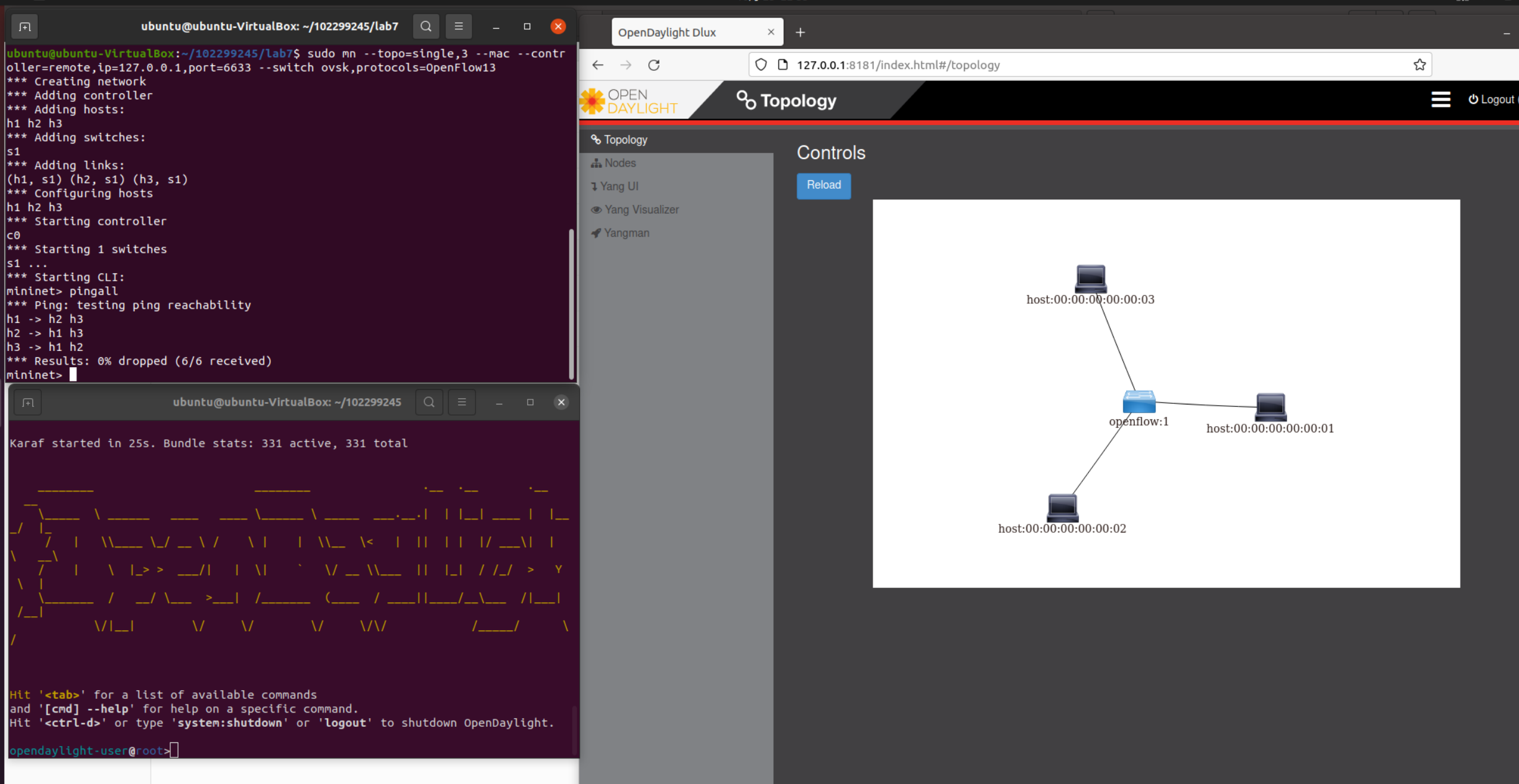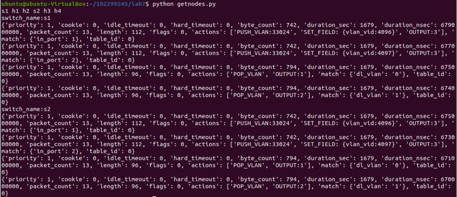 OpenDaylight或Ryu任选其一,编程实现查看前序VLAN实验拓扑中所有节点(含交换机、主机)的名称,以及显示每台交换机的所有流表项。