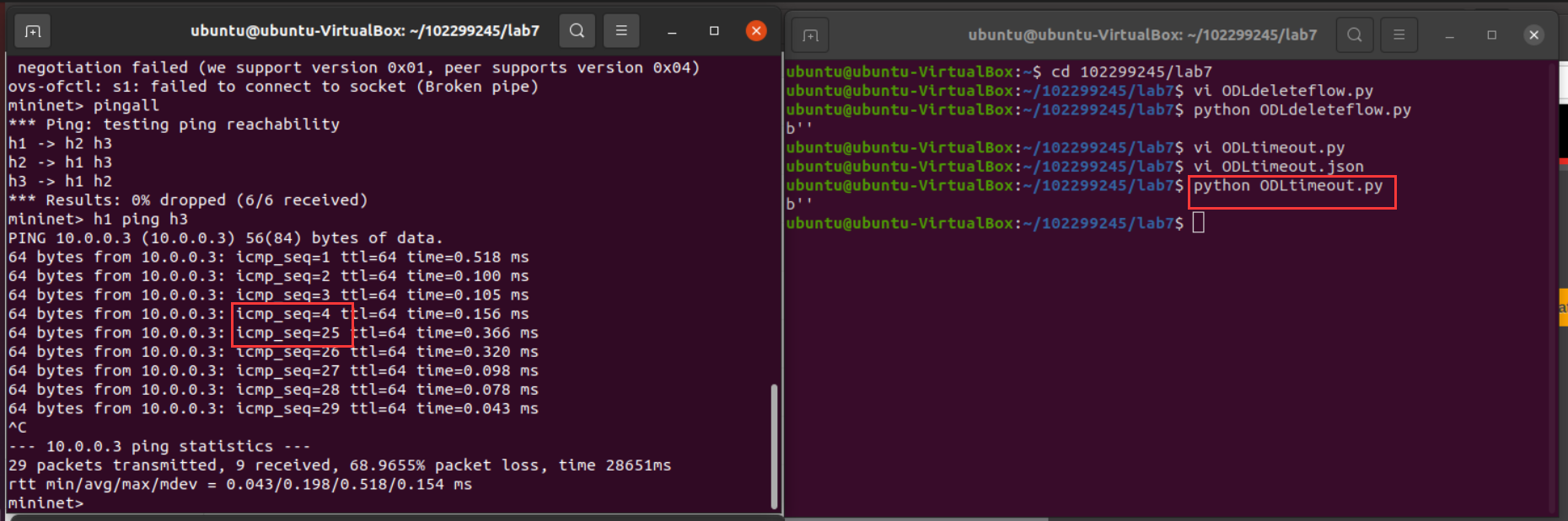 (3) 下发硬超时流表,实现拓扑内主机h1和h3网络中断20s。