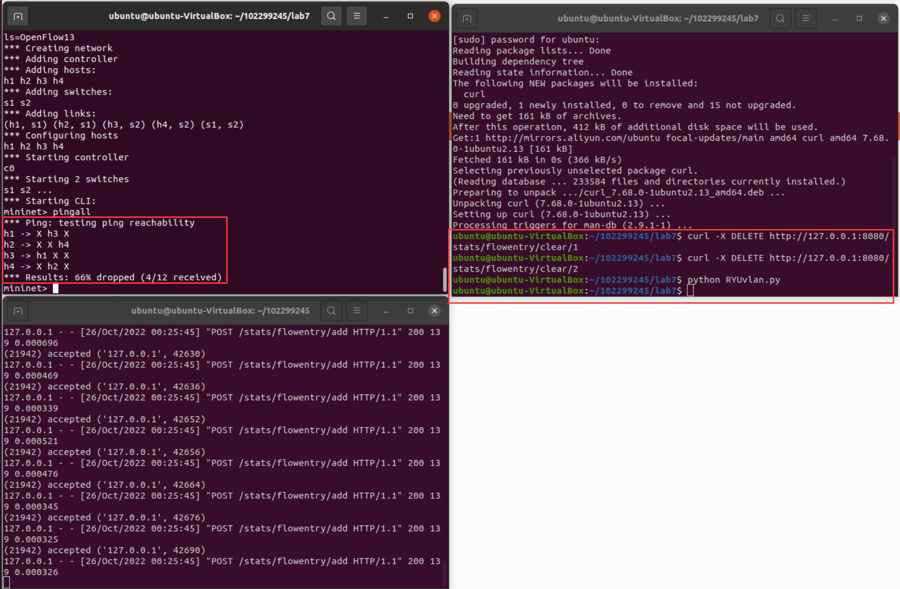 (2) 参考Ryu REST API的文档,基于VLAN实验的网络拓扑,编程实现相同的VLAN配置。