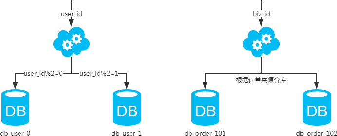 概念:以字段为依据,按照一定策略(hash、range等),将一个库中的数据拆分到多个库中。