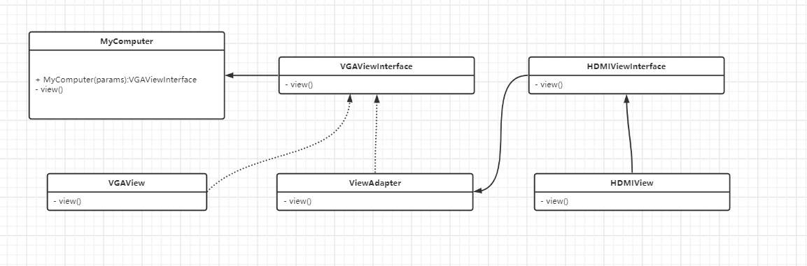 public class ViewAdapter implements VGAViewInterface{ private HDMIViewInterface hdmiViewInterface; public ViewAdapter(HDMIViewInterface hdmiViewInterface) { this.hdmiViewInterface = hdmiViewInterface; } @Override public void view() { hdmiViewInterface.view(); } }
