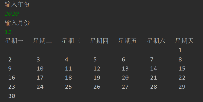 static void text_5(int year,int month) { int n = text_2(year, month); //调用 判断月份 int m = text_3(year); //年天数 int k = text_4(year,month); //月天数 int all_day = m + k; //总天数 int month_firstday = all_day + 1; //输入月份的第一天 int week = month_firstday%7;//判断第一天是星期几(周一至周六:1~6 周天:0) int time=week;//判断第一天前的空间(星期值-1) if(time==0) { time=7; //当week=0时是星期天 } for(int u=0;u<time-1;u++) System.out.print( "\t\t");//输出空间 for(int y=1;y<=n;y++) { System.out.print(" "+y+"\t\t"); //输出月的天数 week=week%7; //判断星期 if(week%7==0) { System.out.println(" "); //星期天时换行 } week++; //星期值+1 } }