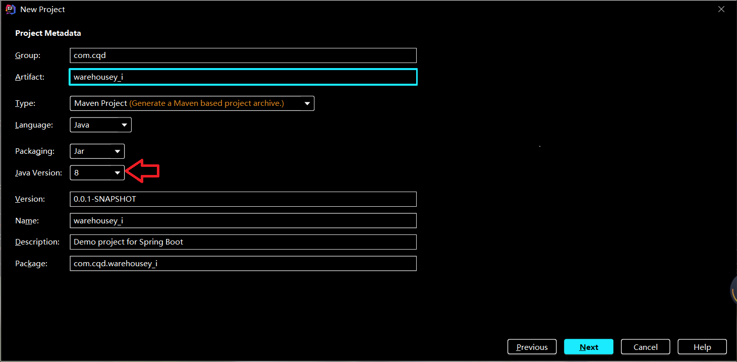 3 输入项目信息 Type 为 Maven,packaging 为 jar,Java version 切换为安装的版本(默认为 11)=> Next