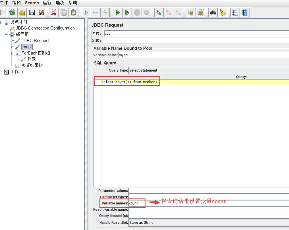 a、添加一个jdbc请求,查询用户表的用户总数,并设置变量count