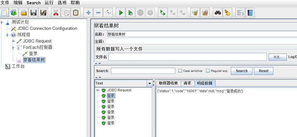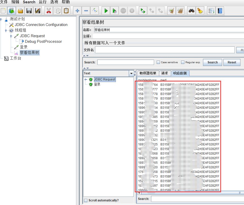 2、添加Debug PostProcessor用于查看变量phone值的获取,添加查看结果树并运行;得到以下结果。