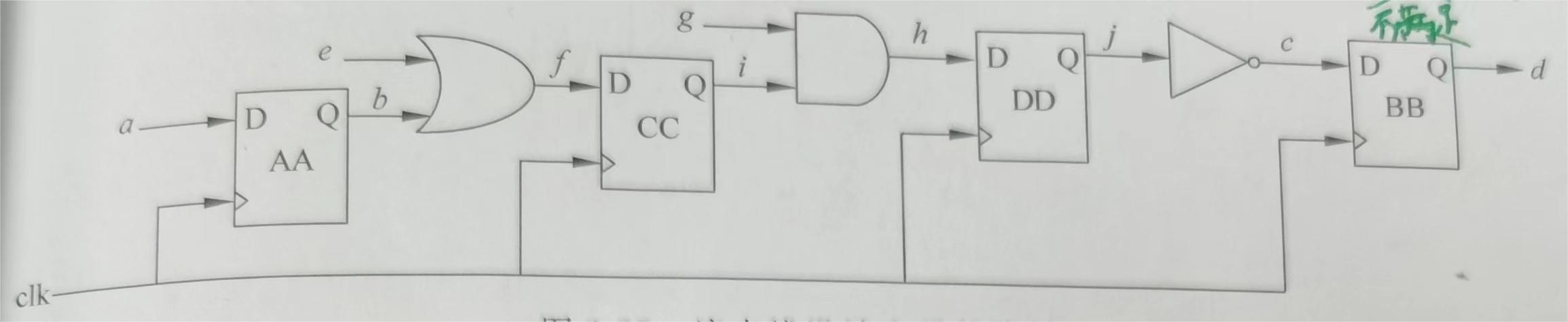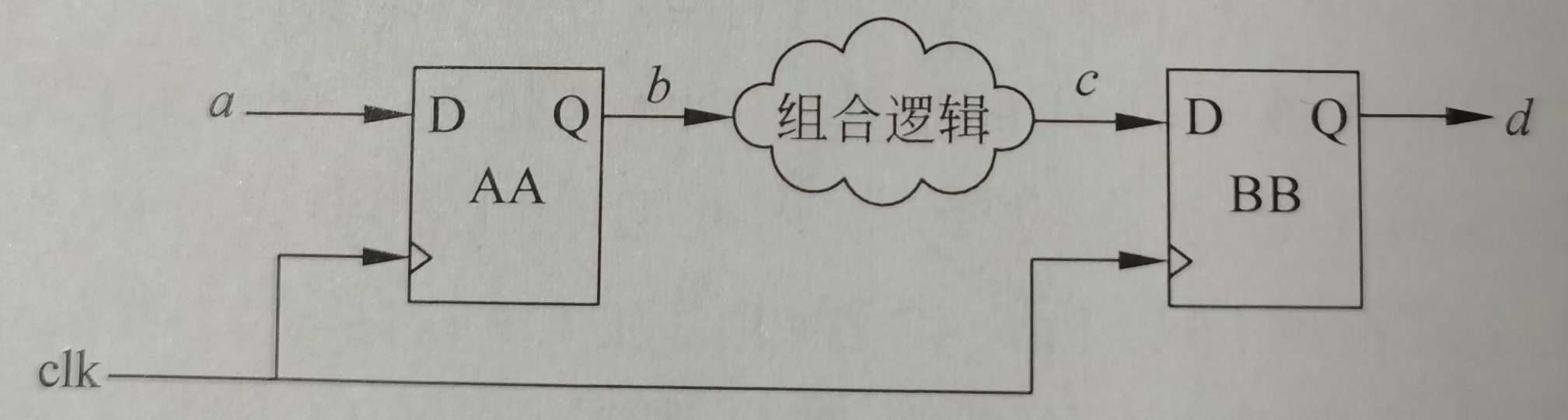 图中寄存器为时钟上升沿触发,当上升沿到来后,寄存器将a端的信号进行采样后在b端进行输出,再经过逻辑组合电路到达B寄存器的c端入口,这之间信号a变成c时要经历寄存器A的反应时间,组合逻辑的延时,还有金属连线的延时,才能变成c信号供B寄存器采样。这些延时必须在下一个时钟对B寄存器进行动作之前完成,还必须预留足够的建立时间,否则寄存器B无法读取出有效的c信号,信号在每一个时钟周期内都获得正确的信号,也称作时许收敛。