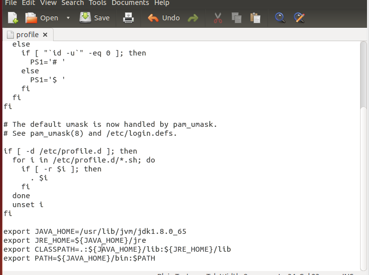 export JAVA_HOME=/usr/lib/jvm/jdk1.8.0_65 export JRE_HOME=${JAVA_HOME}/jre export CLASSPATH=.:${JAVA_HOME}/lib:${JRE_HOME}/lib export PATH=${JAVA_HOME}/bin:$PATH