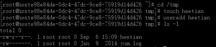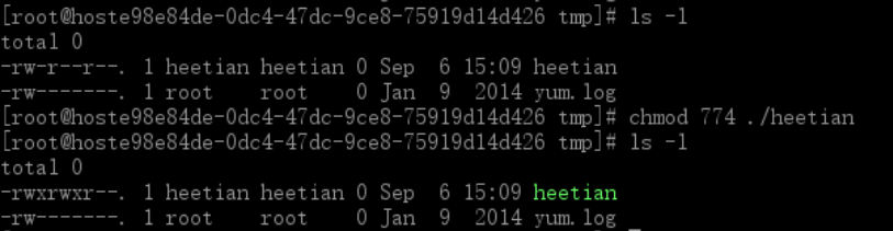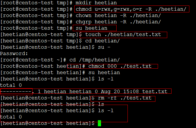 看上图,结合前一个图片,自己思考一下,为什么/tmp/heetian/test.txt文件所有者和用户组都是root,对于heetian来说只有可读权限,为啥heetian也能把它删除了?