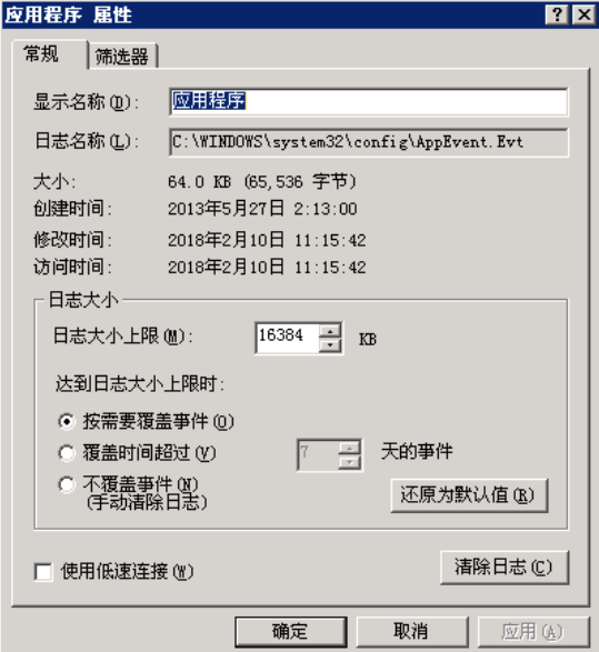 在事件查看器中右键应用程序(或安全性、系统、DNS服务器)查看属性可以得到日志存放文件的路径,并可修改日志文件的大小,清除日志。例如选中“应用程序”右键属性,如下图: