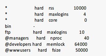 为了与 username 区别,groupname 之前必须加 @。类型必须是 soft 或者 hard。软限制(soft-limit)可以 被超出,通常只是警戒线,而硬限制(hard-limit)不能被超出。