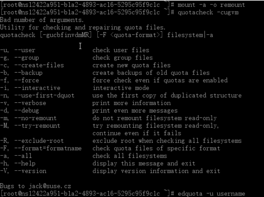 然后,使用 mount -a -o remount 重新挂载相应的文件系统,来激活刚才添加 的选项;然后使用 quotacheck -cugvm 创建一个二进制配额文件,其中包含了机器 可读格式的配额配置。这是配额子系统要操作的文件。然后使用 edquota -u username 为具体的用户配额。