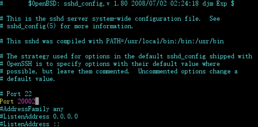 (1)修改ssh的默认端口22,改成如20002这样的较大端口会大幅提高安全系数,降低ssh破解登录的可能性。