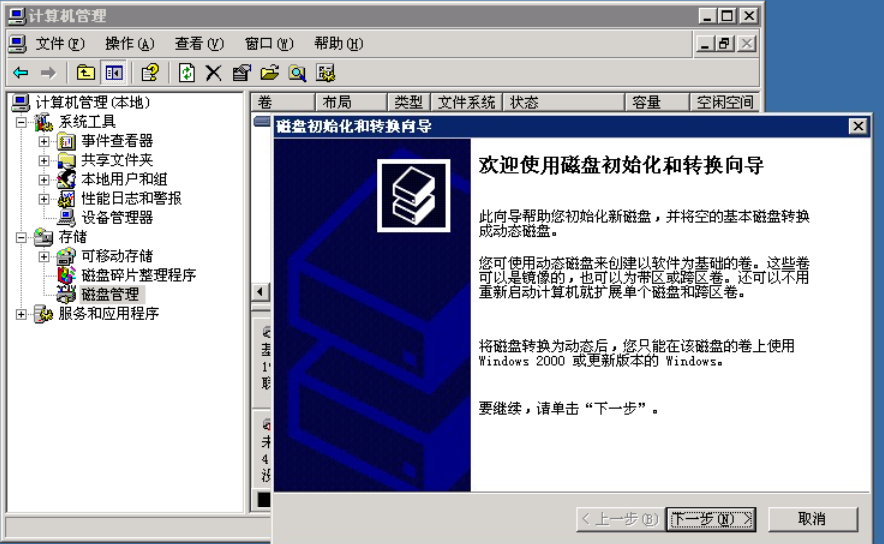 点击磁盘管理,会出现磁盘初始化和转换向导,利用向导添加一块新的磁盘