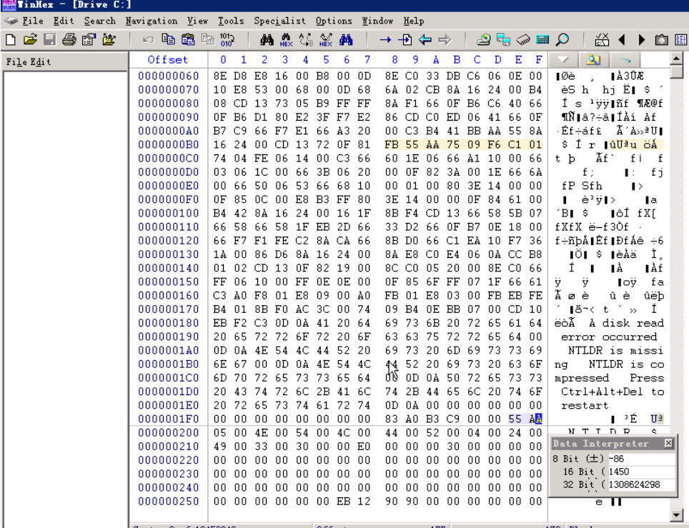 找到第一扇区末尾:000001F0处,查看末尾标志是否为55AA。