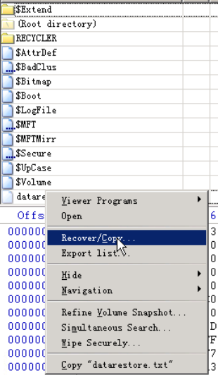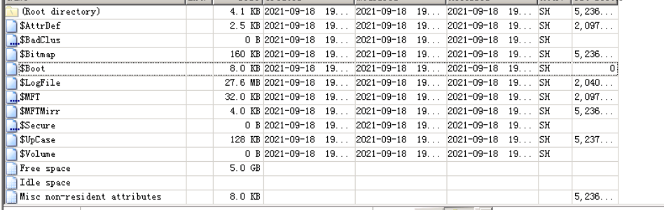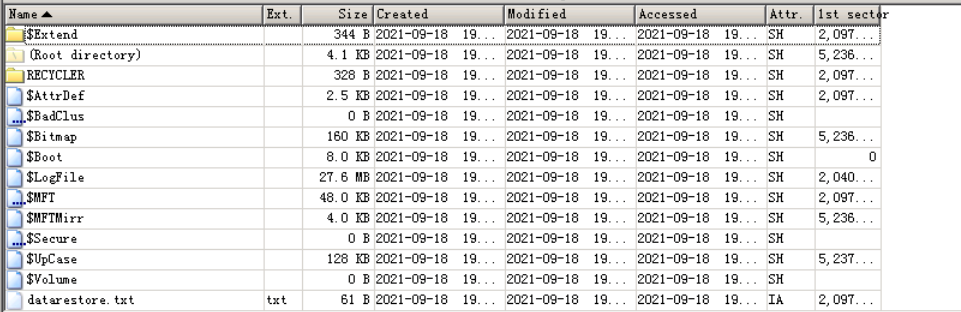 可以看到winhex自动查找硬盘文件系统,查找后找到被删除文件,被删除文件与存在的文件颜色不同:
