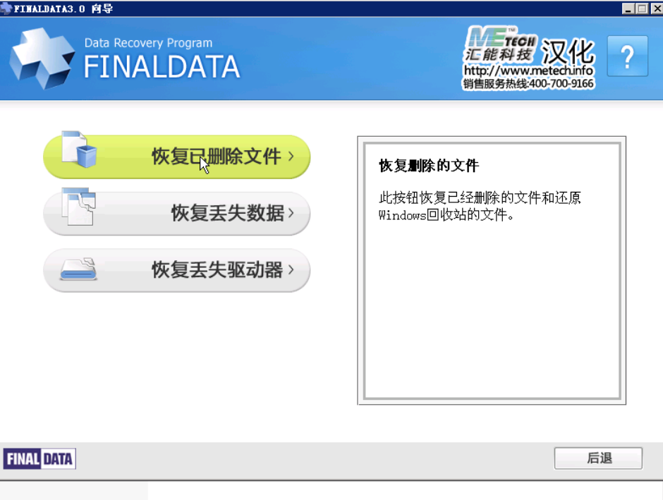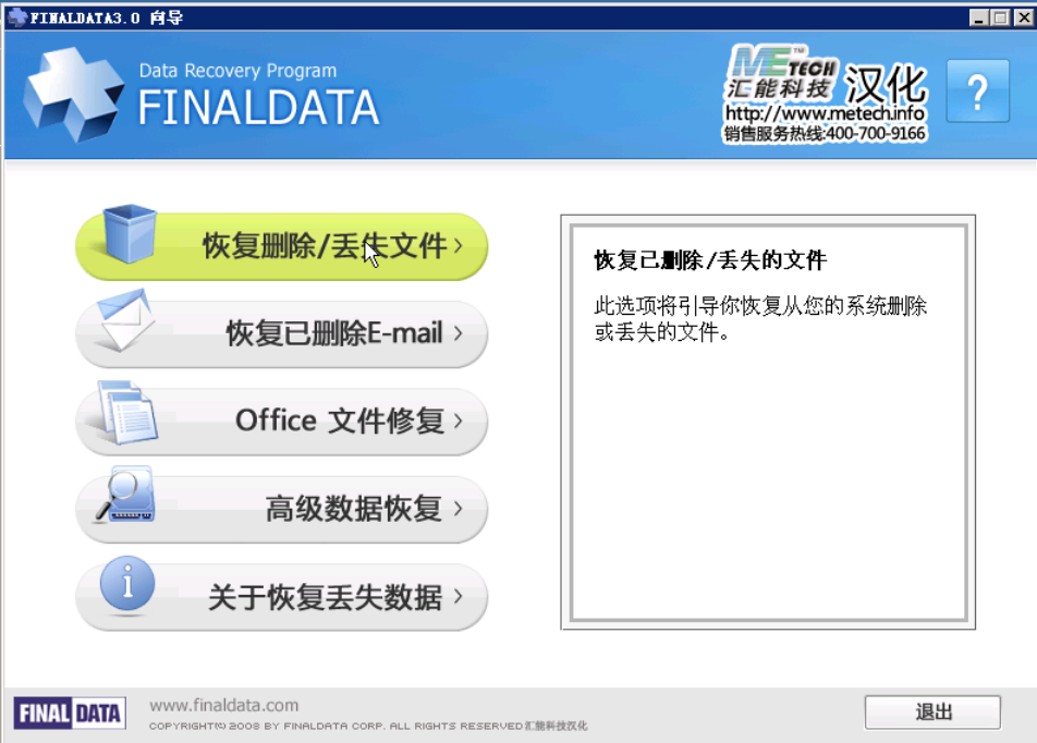 FinalData具有强大的数据恢复功能当文件被误删除(并从回收站中清除)、FAT表或者磁盘根区被病毒侵蚀造成文件信息全部丢失、物理故障造成FAT表或者磁盘根区不可读,以及磁盘格式化造成的全部文件信息丢失之后,FinalData都能够通过直接扫描目标磁盘抽取并恢复出文件信息(包括文件名、文件类型、原始位置、创建日期、删除日期、文件长度等),用户可以根据这些信息方便地查找和恢复自己需要的文件。甚至在数据文件已经被部分覆盖以后,专业版FinalData也可以将剩余部分文件恢复出来。
