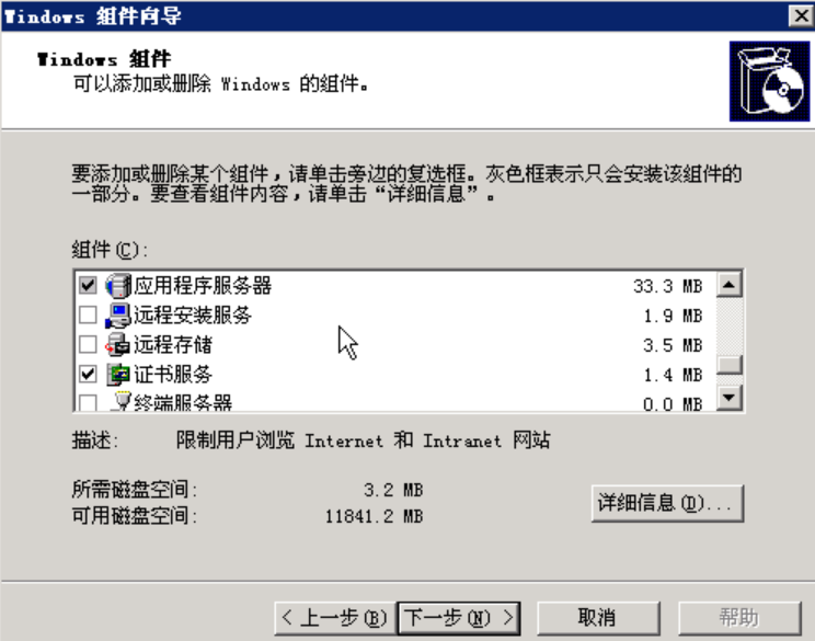 依次点击:“开始”->>“控制面板”->>“添加或删除程序”,以打开添加或删除程序对话框。依次点击:“添加删除windows组件”,在组件向导中选中“应用程序服务器”与“证书服务”,先不要点击下一步: