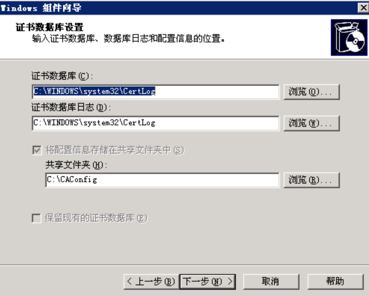 下一步后,会出现证书数据库的相关设置,不用修改,继续下一步: