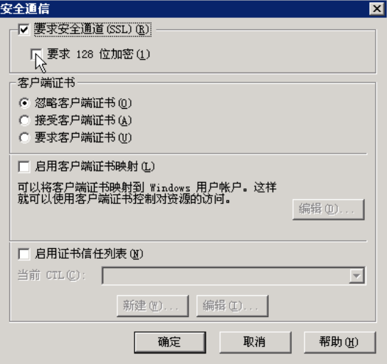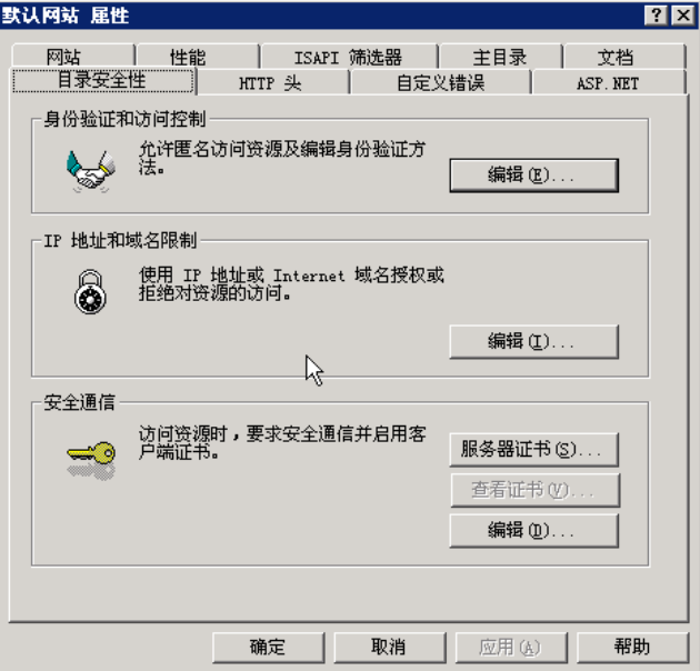 安装完成后,打开IIS,右键“默认网站”,选择“属性”,在“默认网站属性”中选择“目录安全性”标签,点击“服务器证书”: