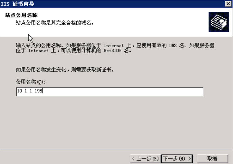 填写公用名称,由于在本环境中没有使用DNS服务器,没有域名因此使用IP地址访问,在公用名称中输入本机的IP地址,如果名称错误,后面过程中会出现问题,因此应仔细核对: