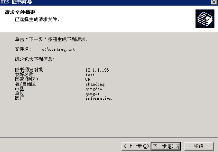 确认信息后,完成请求证书的设置。