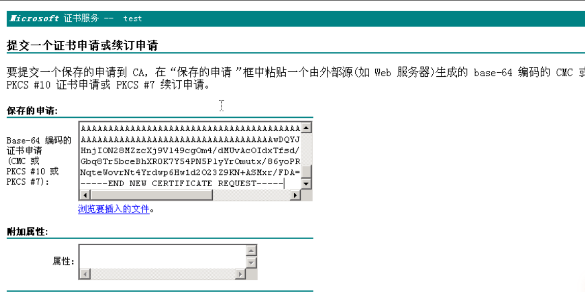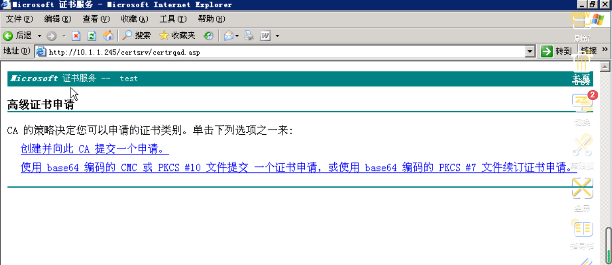 在下图的页面中点击“高级证书申请”, 在出现的页面中选择第二个“使用base64编码的CMC……”
