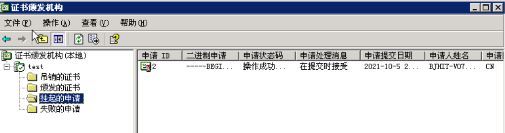 证书的颁发在证书服务器中操作,接下来的操作是证书审核员的角色,切换到CA服务器,点击“开始”>>“管理工具”>>“证书颁发机构”。可以在挂起的申请中看到刚才我们的申请: