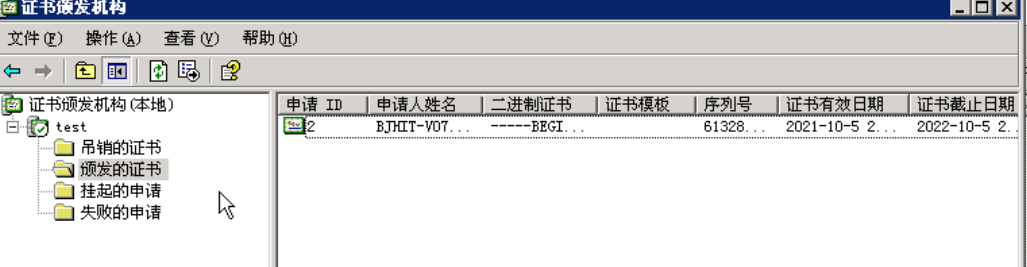 右键所有任务,选择“颁发”。颁发后可以在“颁发的证书”中看到,如下图: