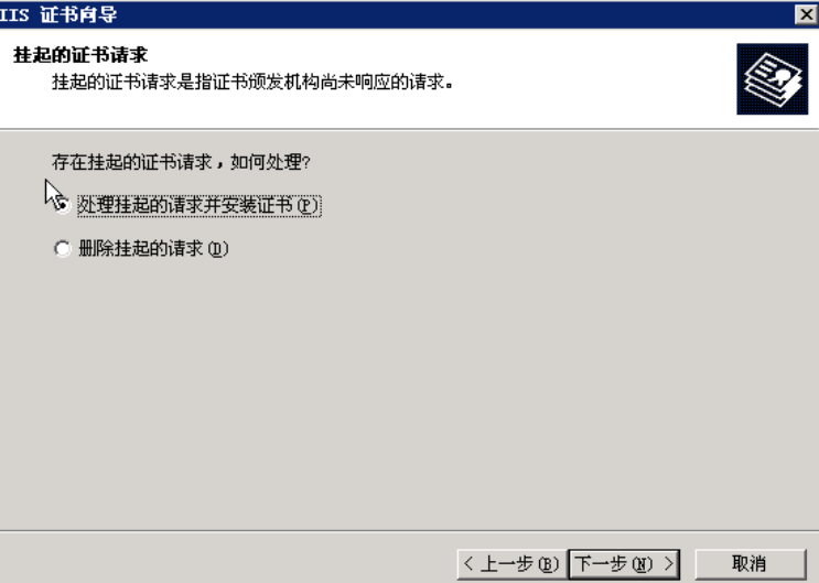 在“处理挂起请求”中选择“浏览”,选择刚才下载的证书文件,并打开,下一步,使用默认的443端口,点击下一步: