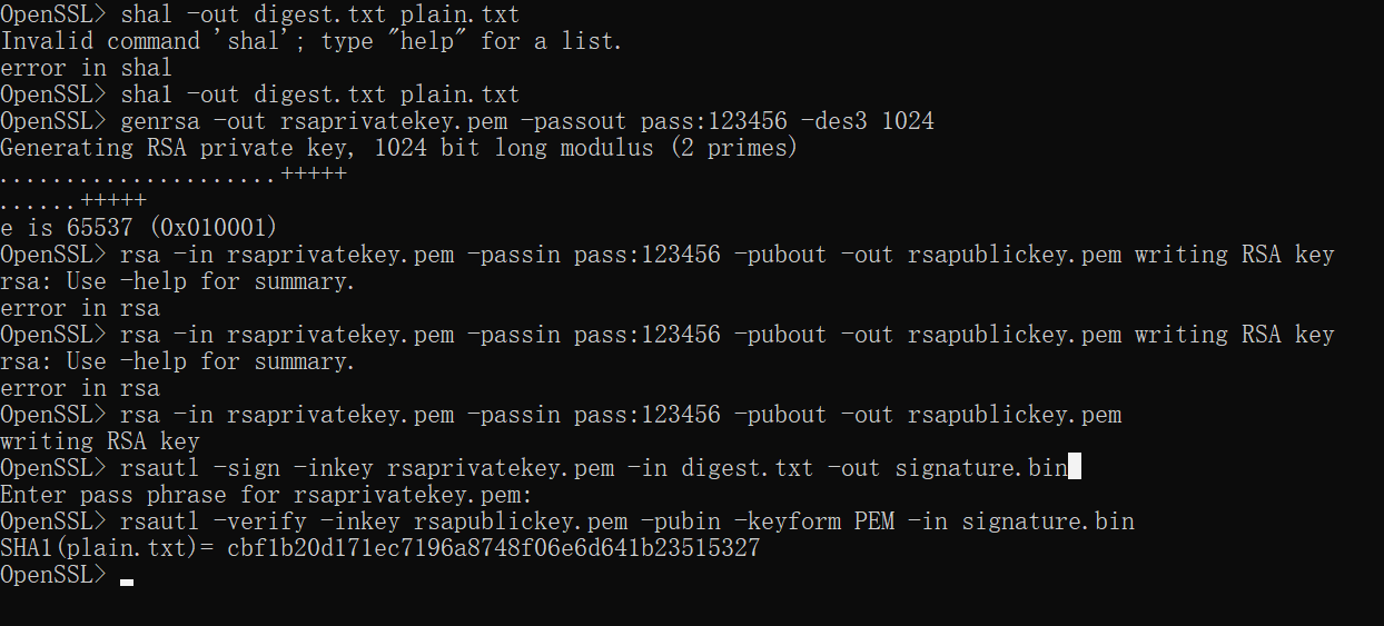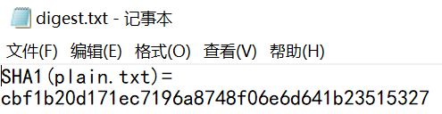 - 计算plain.txt的哈希值,输出到文件digest.txt。利用RSA算法对摘要进行签名。