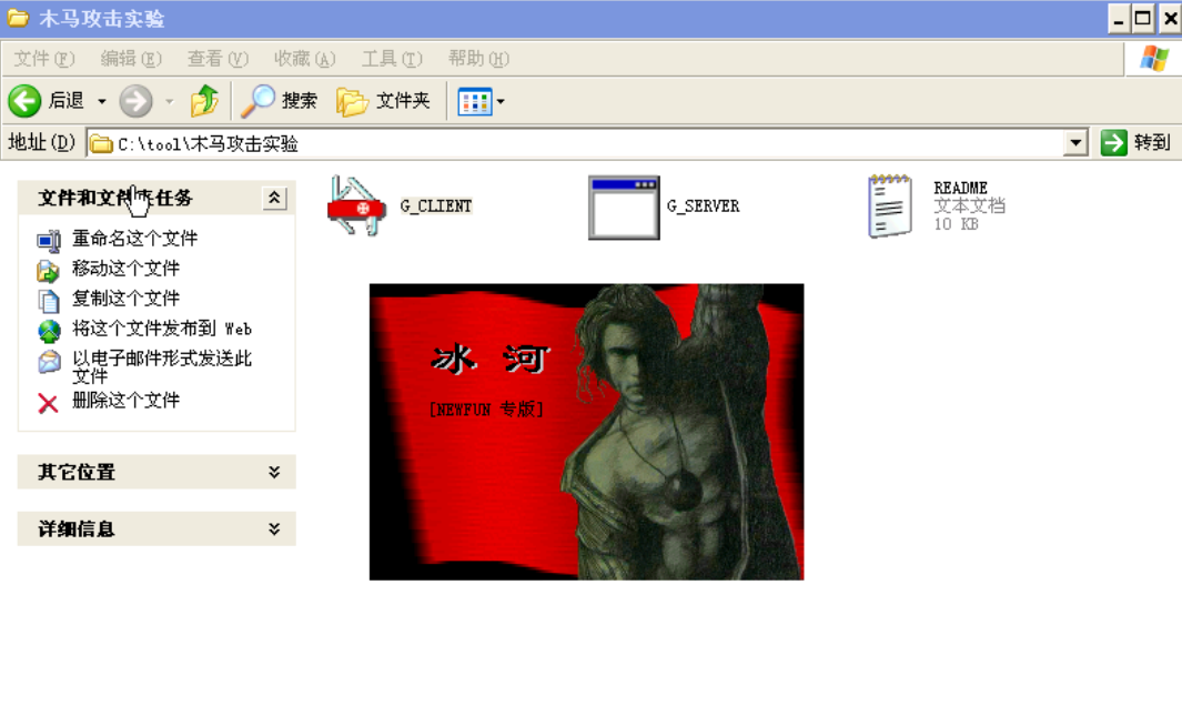(1)服务器端。打开C:\tool\“木马攻击实验”文件夹,在“冰河”文件存储目录下,双击G_SERVER。G_Server是木马的服务器端,即用来植入目标主机的程序。此时,会弹出“Windows安全警报”窗口,点击“解除阻止”,木马的服务器端便开始启动。(如果防火墙已关闭会直接运行不会弹窗)
