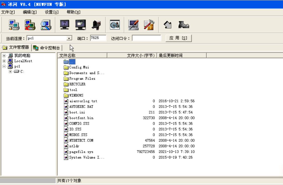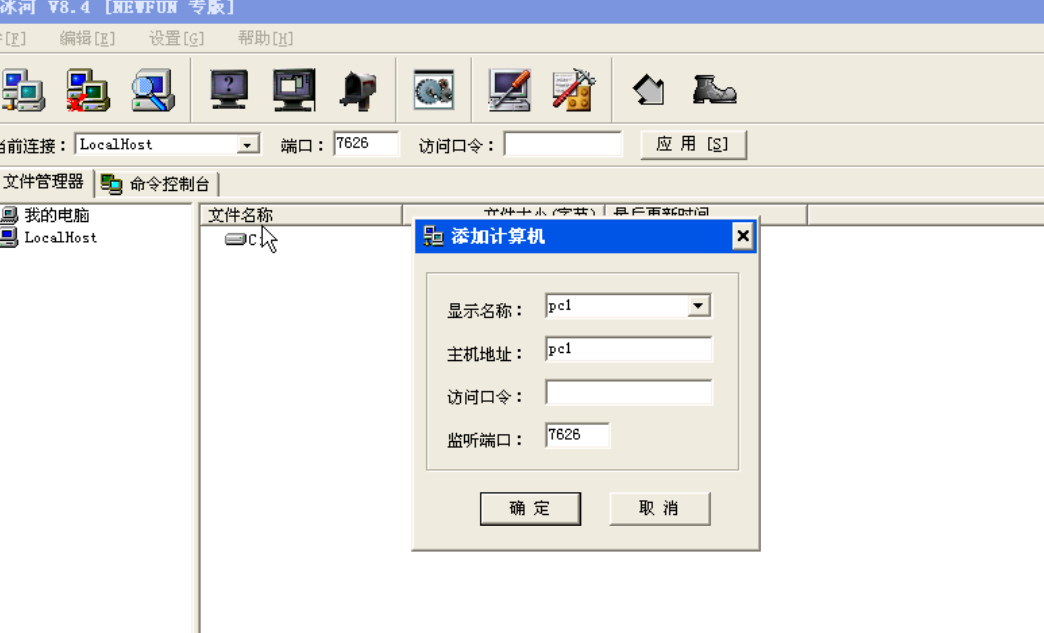 单击添加的主机(PC1)出现如图6添加主机界面,如果连接成功,则会显示服务器端主机上的盘符如图7服务器端主机盘符。这时我们就可以像操作自己的电脑一样操作远程目标电脑.