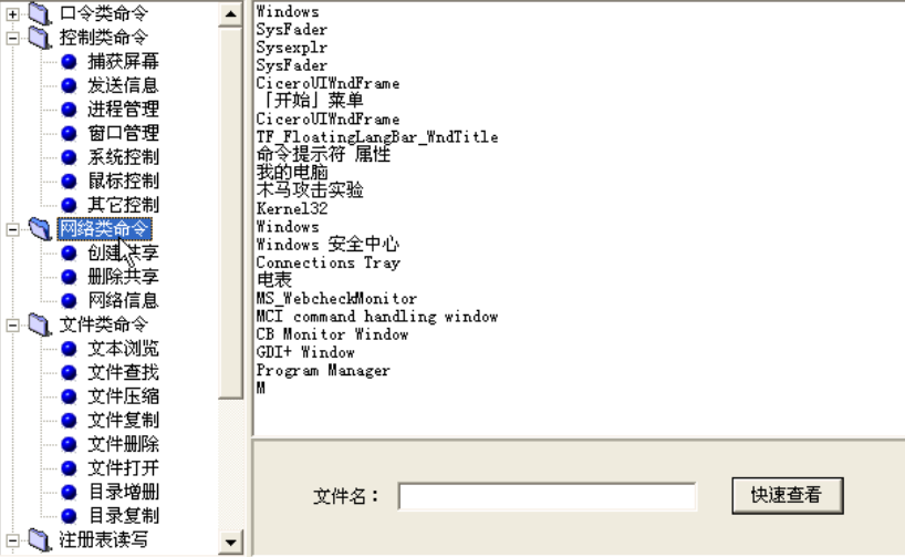 该类命令中,“文件浏览”、“文件查找”、“文件压缩”、“文件删除”、“文件打开”等菜单可以查看、查找、压缩、删除、打开远程主机上某个文件。“目录增删”、“目录复制”、可以增加、删除、复制远程主机上的某个目录。