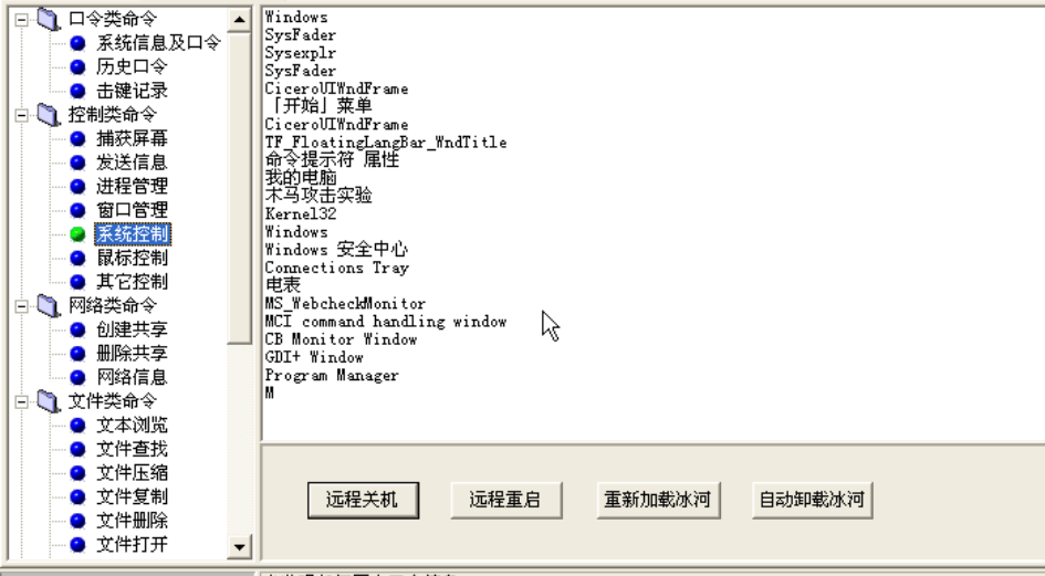 “系统管理”:这个功能可以使远程主机进行关机,重启,重新加载“冰河”自动卸载”冰河”的操作