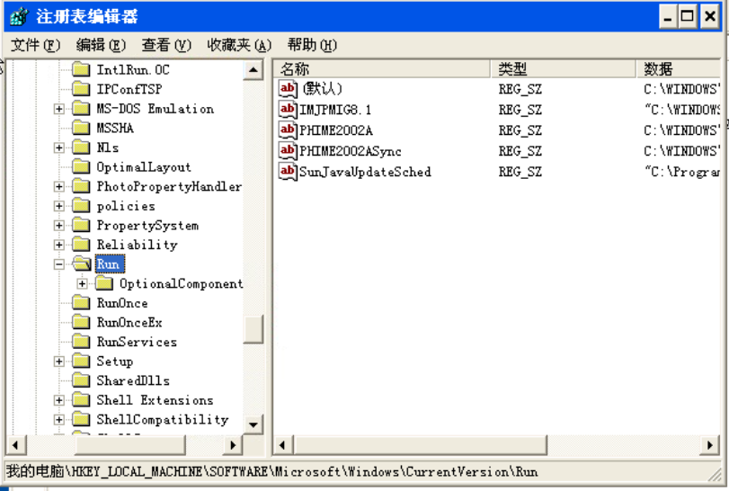 上面两个注册表的子键目录Run和Runservices中存放的键值是系统启动时自动启动的程序,一般病毒程序,木马程序,后门程序等都放在这些子键目录下,所以要经常检查这些子键目录下的程序,如果有不明程序,要着重进行分析。