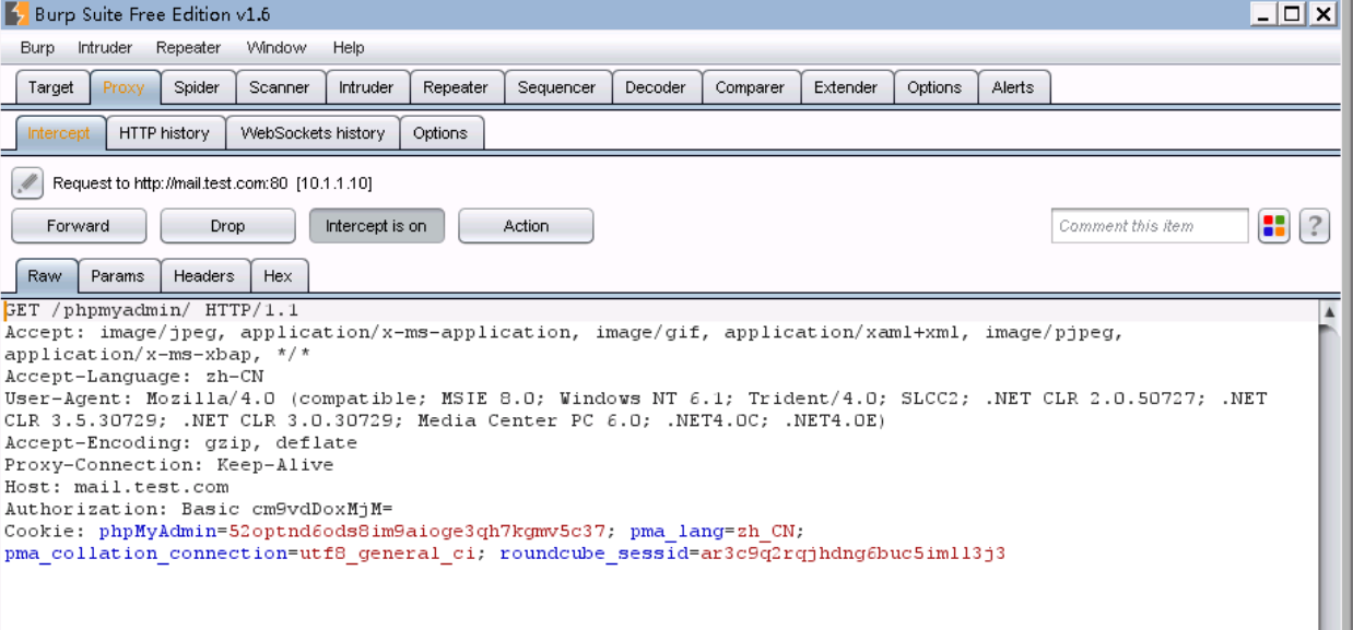 5、接下来对phpmyadmin进行暴力破解,随便输入一个用户名和密码,比如此处我输入:用户名:root 密码:123,页面提示错误,然后查看burpsuite截获到的数据包。