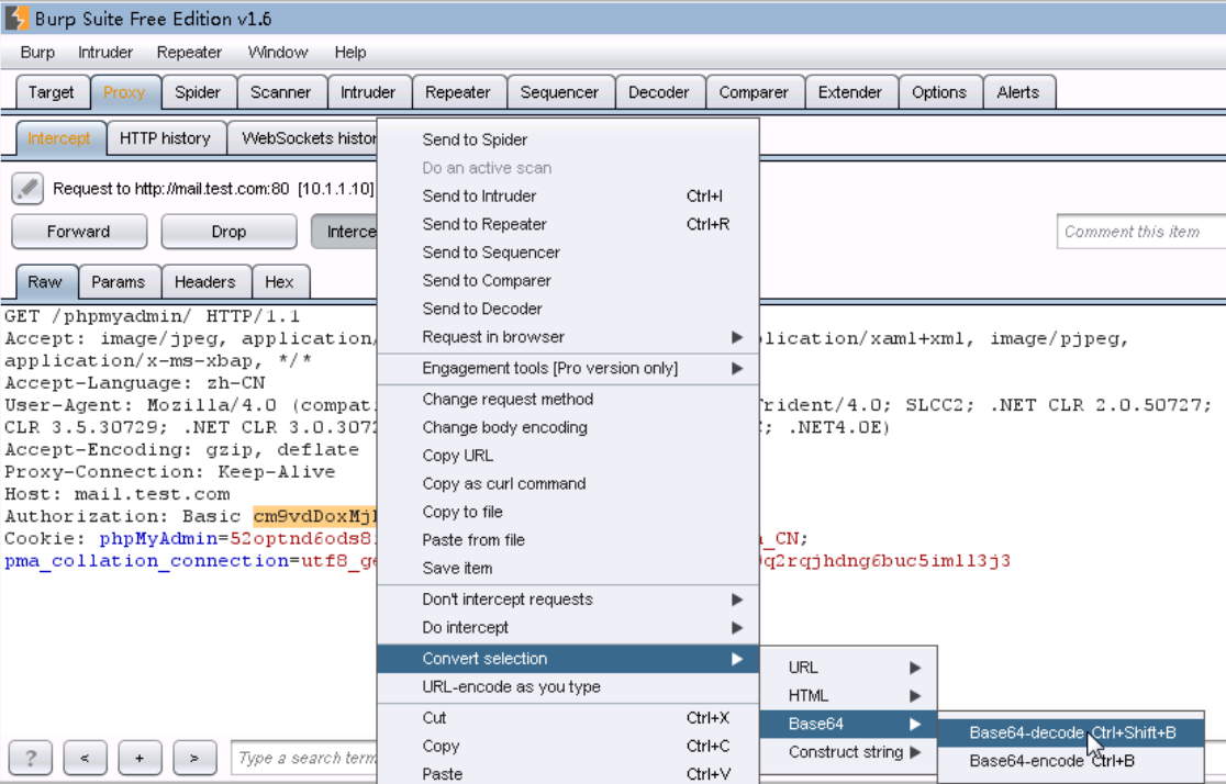 6、找到Authorization,选中Basic后边的字符串,进行如下步骤:右键convert selection->base64->base64-decode。