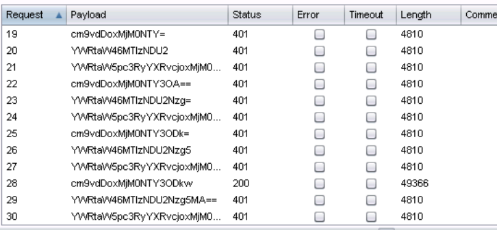 14、单击intruder下的start attack,一段时间后,发现了一个length和其他的不同。